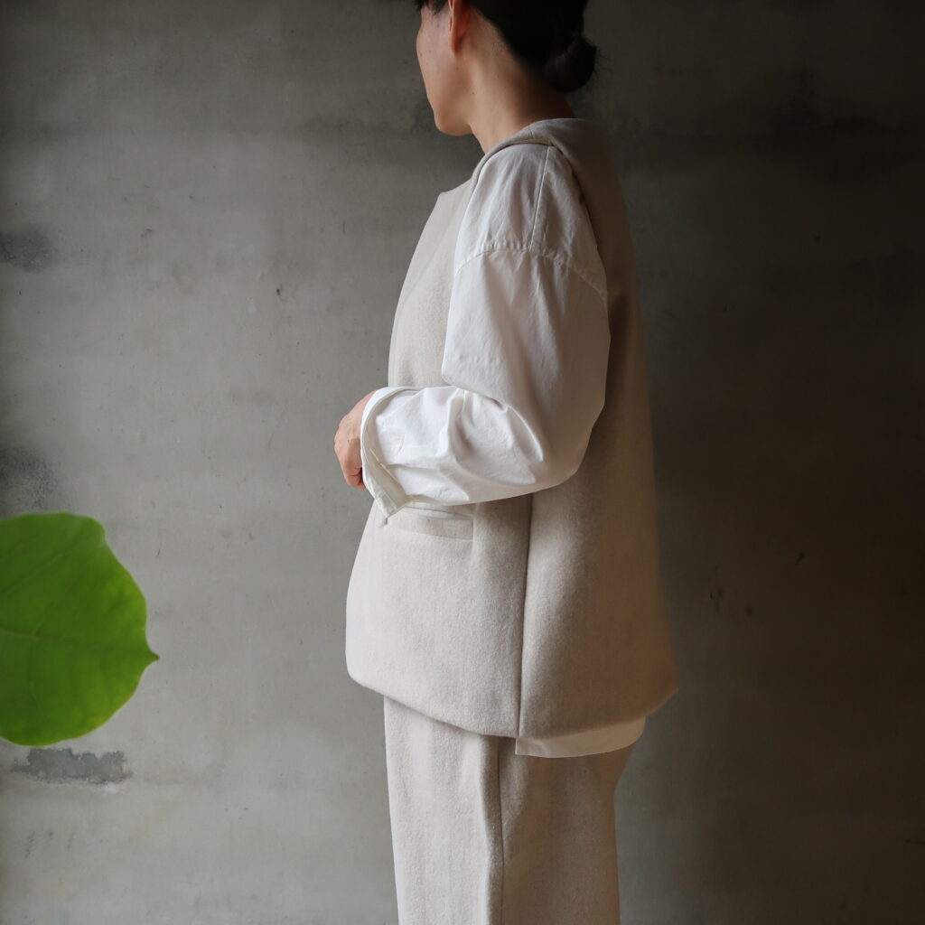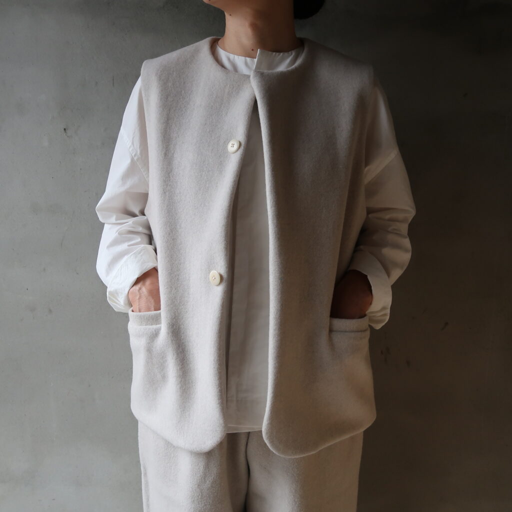 使用している素材は、昨シーズンから継続して制作しているスモックと同素材で、厚みがありながらも軽く柔らかで、温かなウール100%のもの。