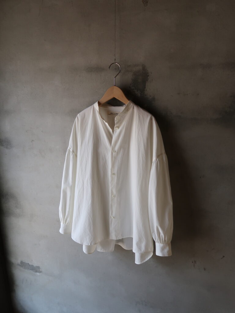 後身頃のヨーク部や袖山、袖口に、たっぷりとギャザーを施した、ボリュームたっぷりのスタンドカラーブラウスです。