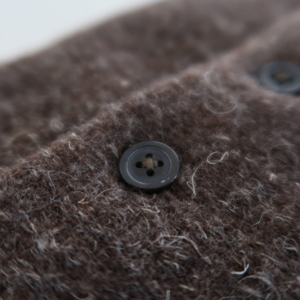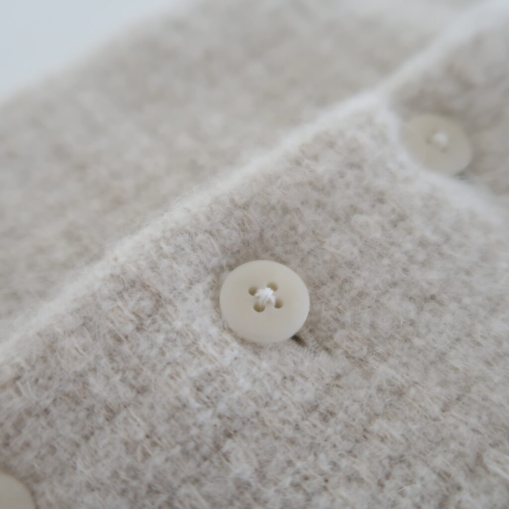 ボタンで開閉できる仕様になっていて、アイボリーはナットボタン、ダークブラウンはペン貝ボタン、それぞれ天然のものを使用しています。