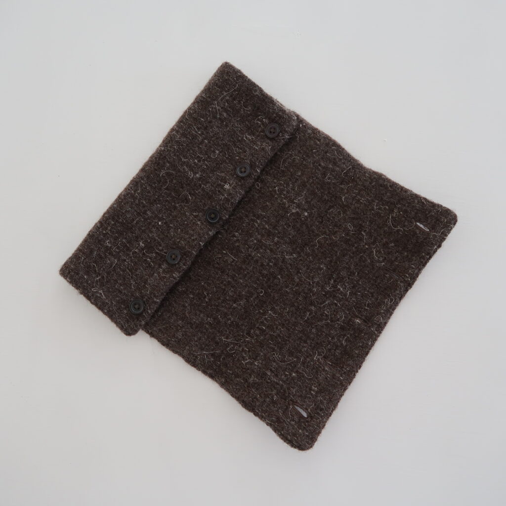 経糸に無染色ウール、緯糸にアルパカ×リネンの糸を掛け合わせて、手機で組織織りにして織り上げた後、2重の仕立てにして形にした製品です。