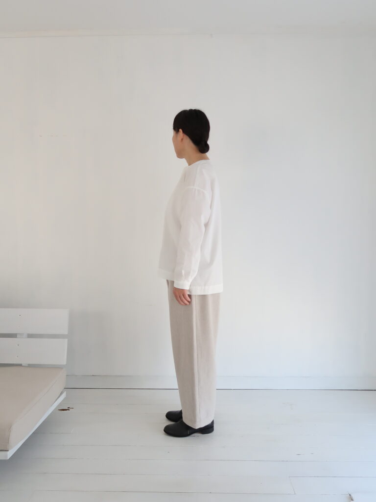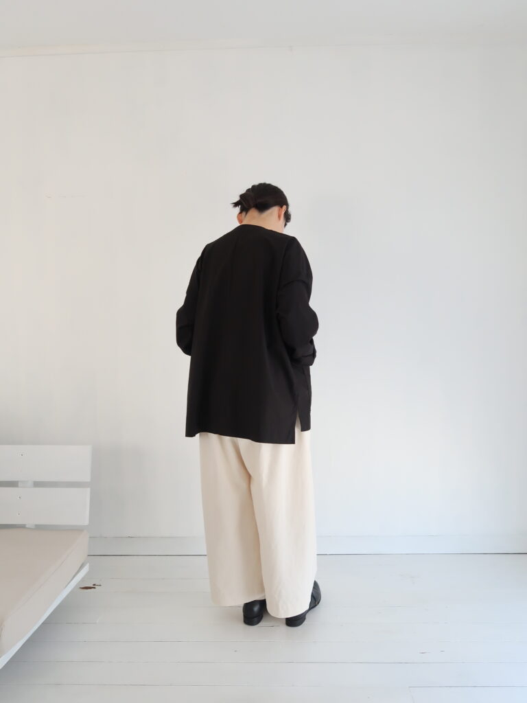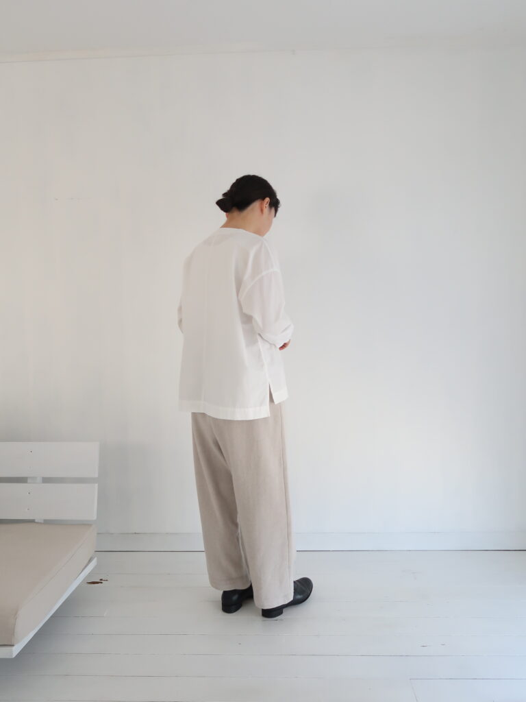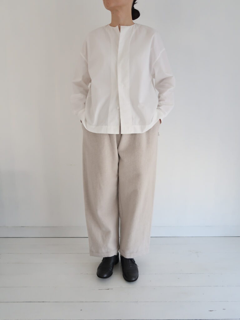 what is there の定番シャツを考える際、自分たちの好みを掘り下げていくと、どうしてもノーカラーのものに行き着くのですが、ヨークをなくしたり、比翼仕立てだったり、色々と納得できるところまで削ぎ落して仕上がったのが、今回のシャツです。