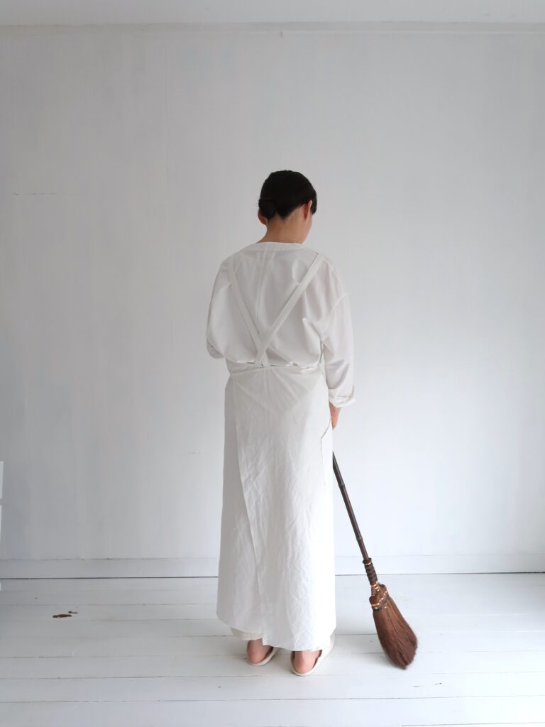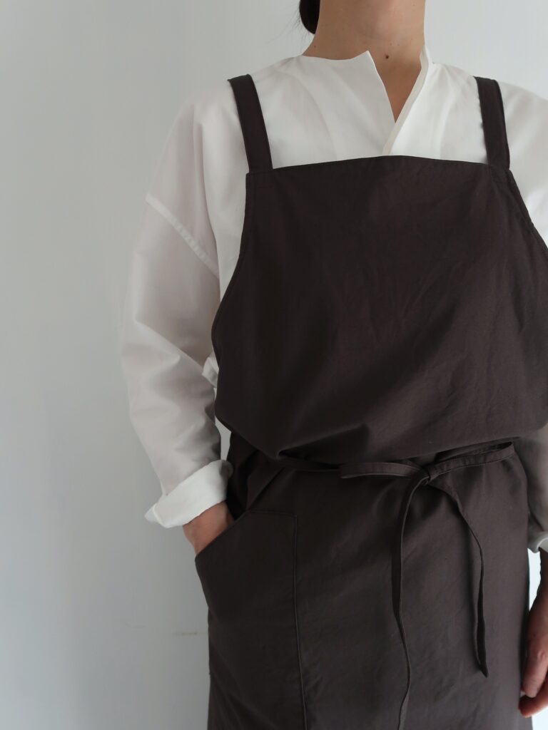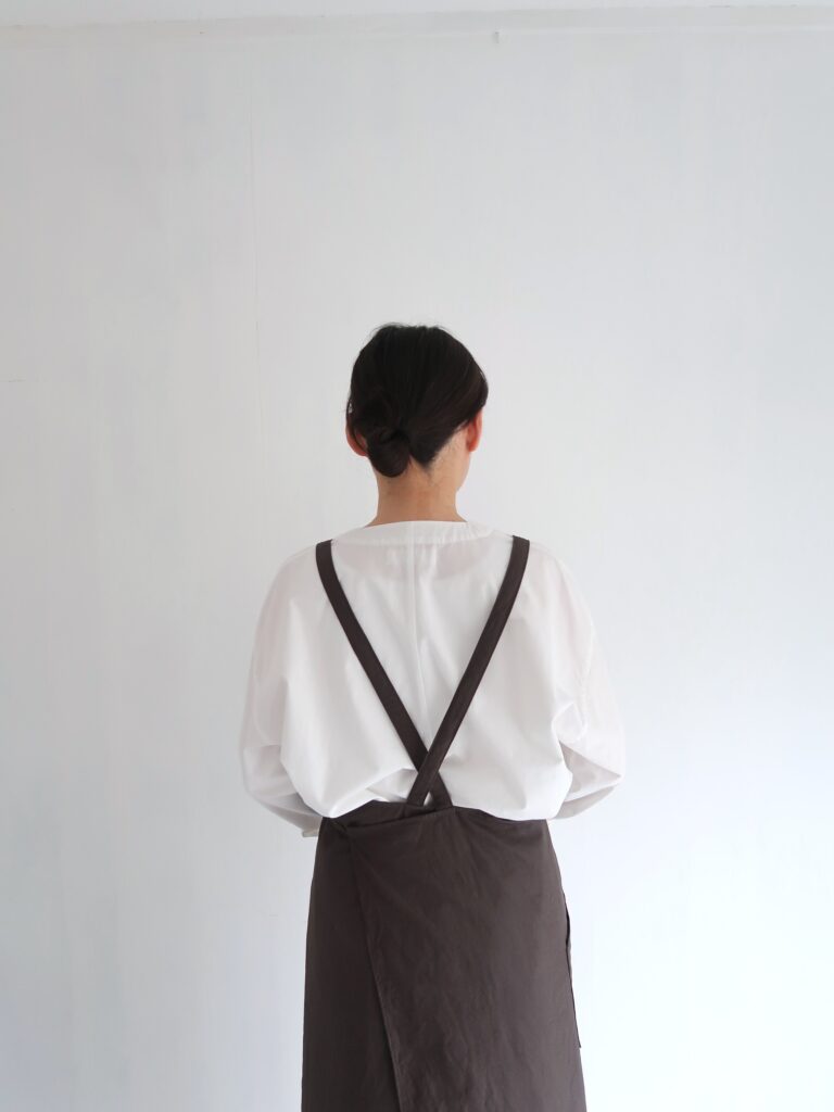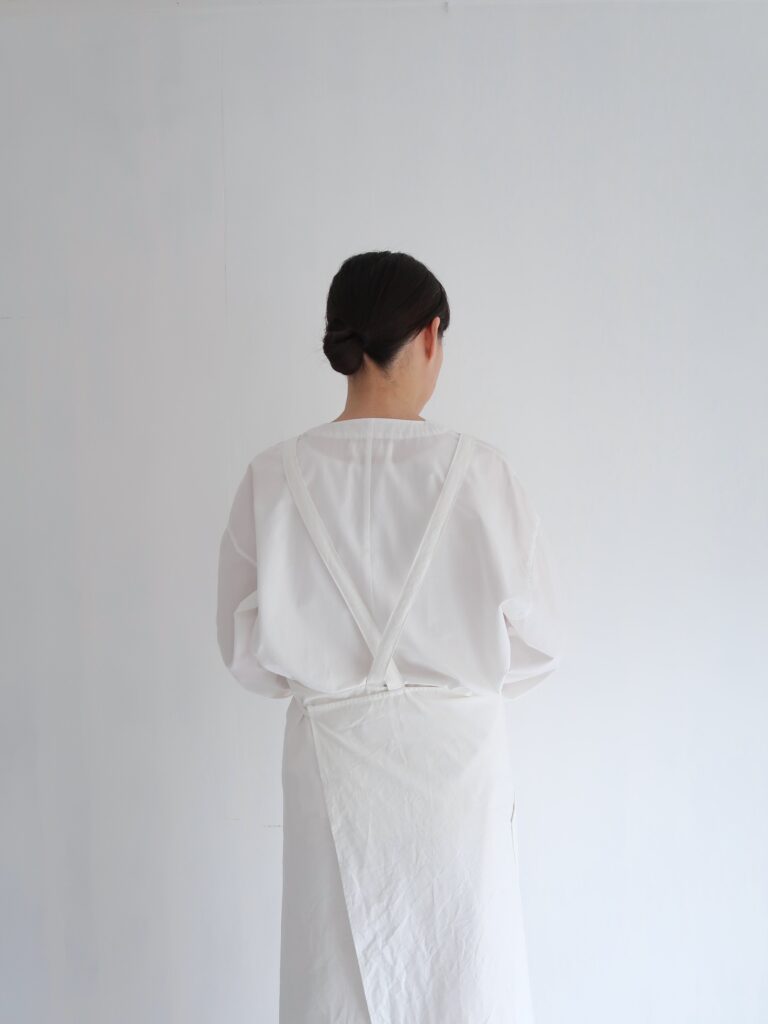 what is there の定番のアトリエエプロンの素材を、今展示では、高密度でハリのある、コットンのホースクロスを使用して制作しました。( 通常は高密度リネン )