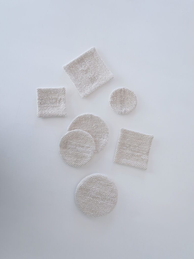 what is there では、10年以上定番として織り続けているテキスタイルで、少しずつ形とサイズが増え、現在は 四角 3サイズ、丸型 3サイズのコースターと、ポットマット、鍋つかみなどがあります。