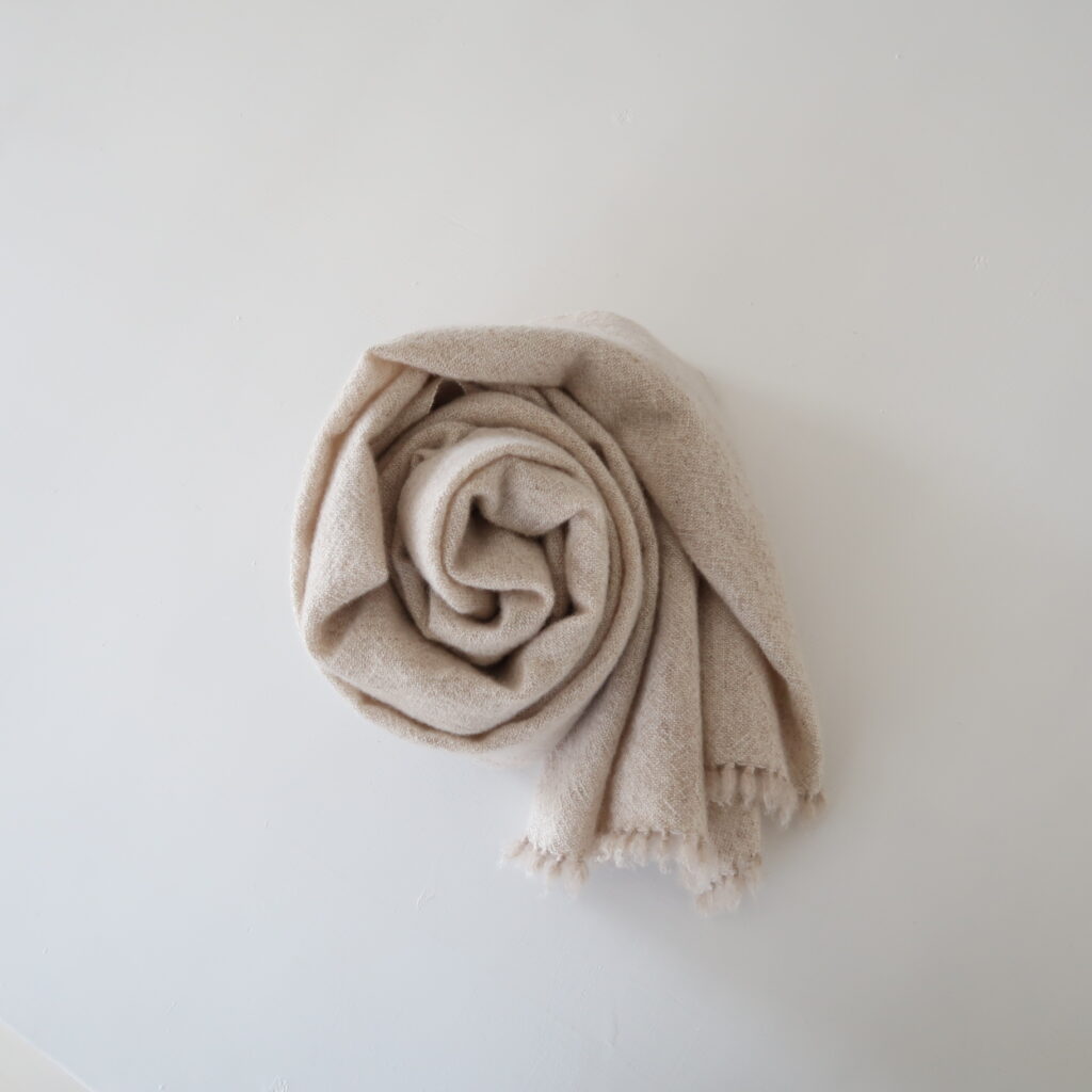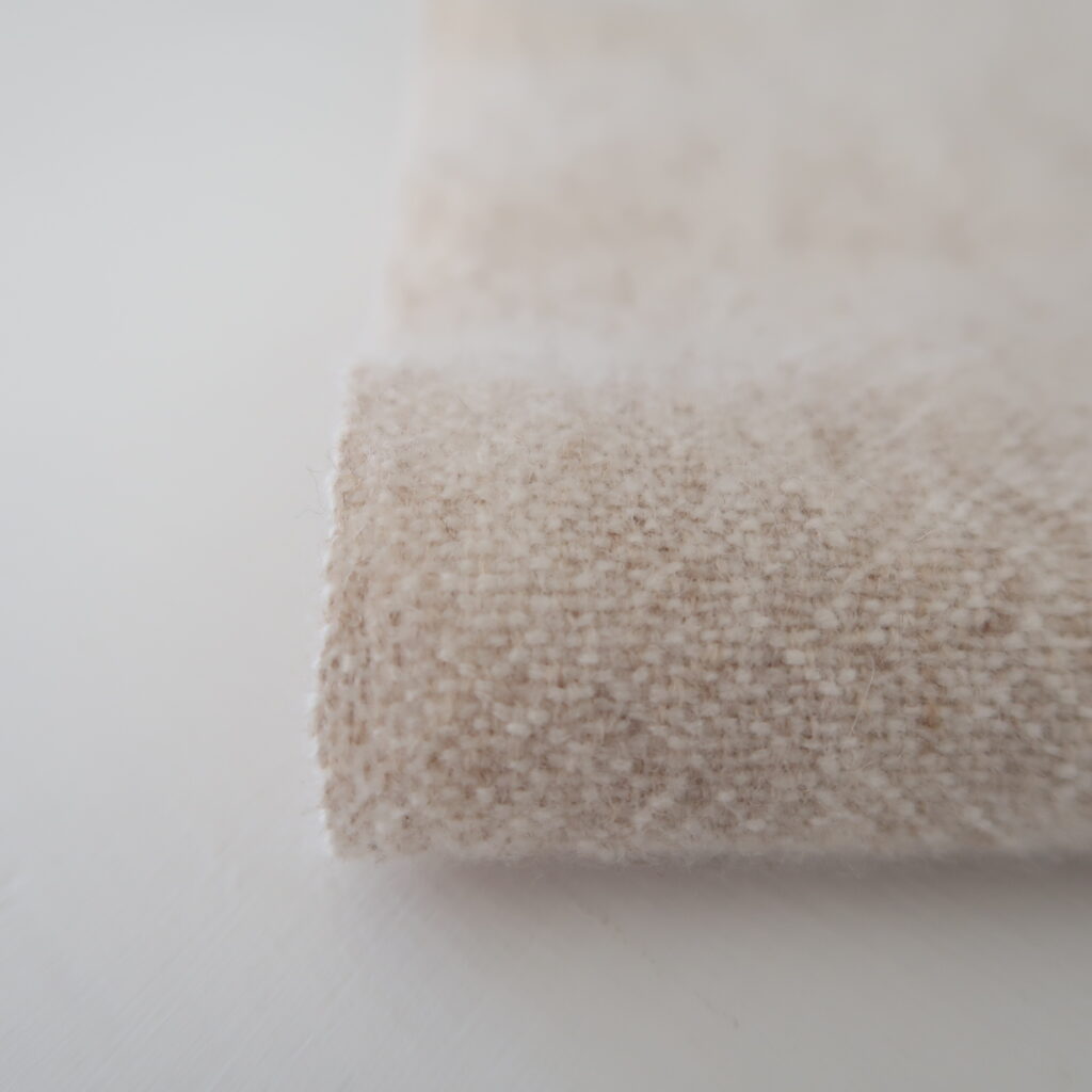 杢 lt.beige というカラーは、経糸に lt.beige、緯糸に snow white のカシミヤ糸を掛け合わせ、杢調にして織り上げています。